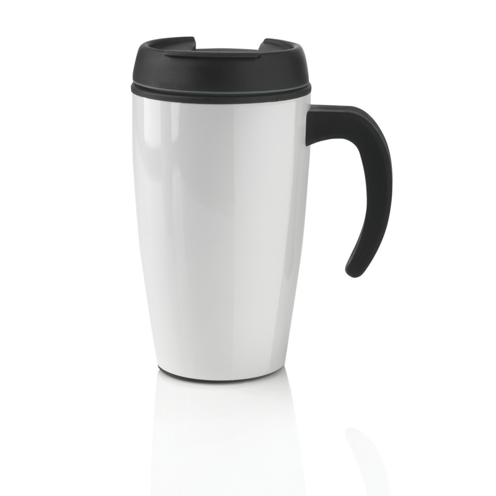 Ten kubek termiczny z nadrukiem zasługuje na szczególną uwagę ze względu na swój design. Jest on niezwykle nowoczesny. Sam kubek jest biały, więc stanowi świetne tło dla znaków graficznych. Jego wieczko oraz uchwyt zostały wykonane z czarnego tworzywa. Całość prezentuje się bardzo elegancko.